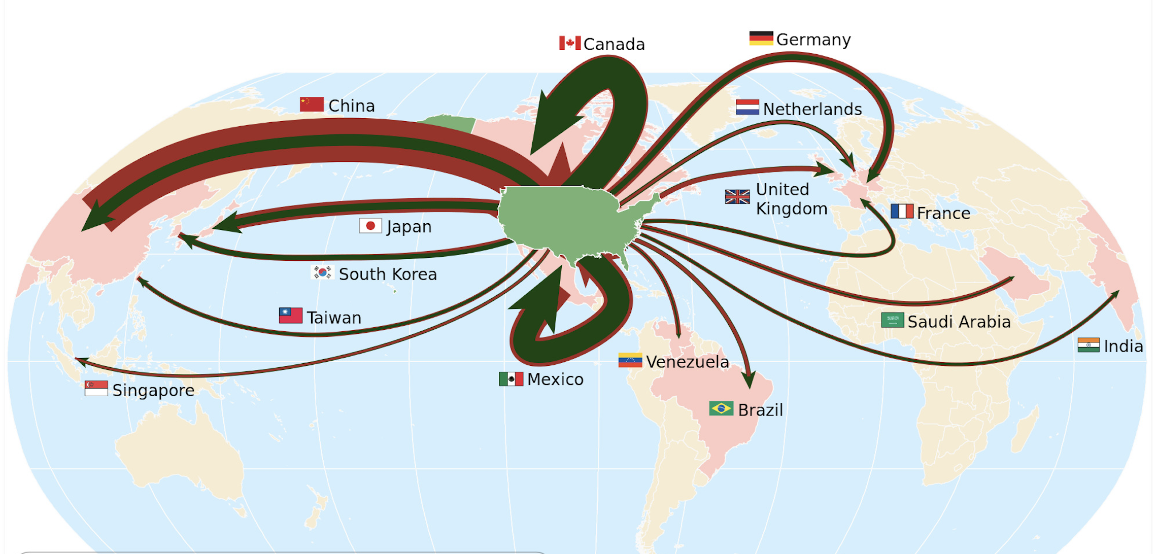 (Foto: mappa USA–Messico–Cina con frecce finanziarie)